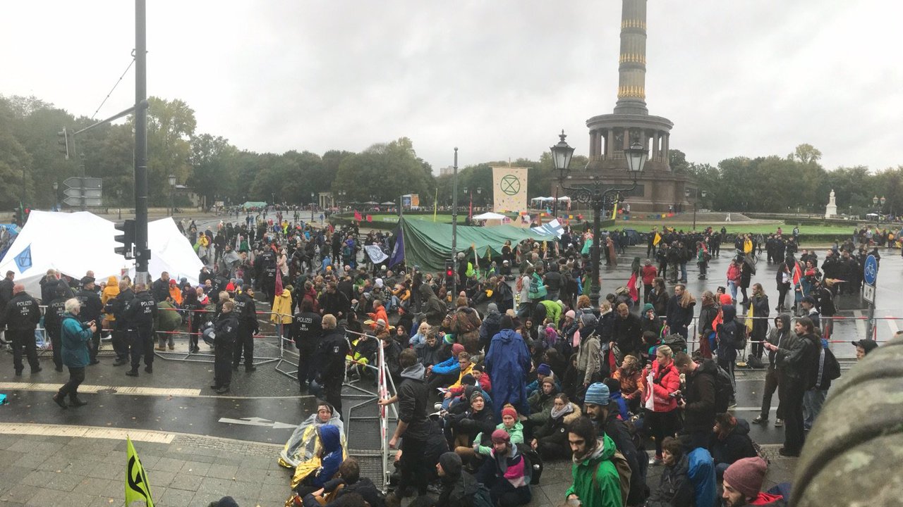 Trotz des ungemütlichen Wetters herrscht eine fröhliche Stimmung an der Siegessäule, es wird gesungen und getanzt. Wir sind auf jedes Wetter vorbereitet! Kommt vorbei, gerne mit Regenjacke, Essen und viel Lust auf eine lebenswertere Zukunft.