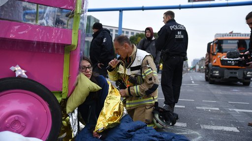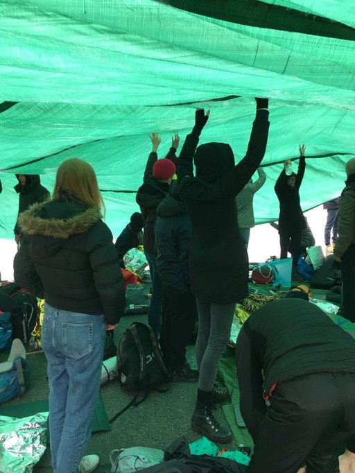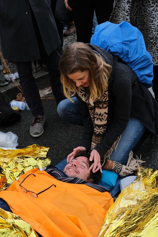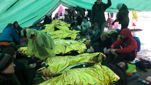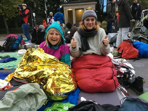 In Rettungsdecken gewickelt versuchen die sechs Gruppen an der Siegessäule über Nacht warm zu bleiben und sich zu erholen. In der Kälte kommt der Schlaf nicht leicht - trotzdem ist die Stimmung immer noch gut. Die turbulenten Ereignisse und neuen Erfahrungen des vergangenen Tages wirken nach und stimmen hoffnungsvoll. Außerdem werden die Rebel:innen von der Arche und unserem tollen Nashorn bewacht. (bq)