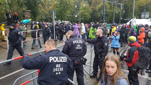 Aber wir wiederholen uns gerne: wir sind gekommen, um zu bleiben. Die Menschen sind ausgelassen und singen "Klimaschützen ist kein Verbrechen!" und klatschen dazu.