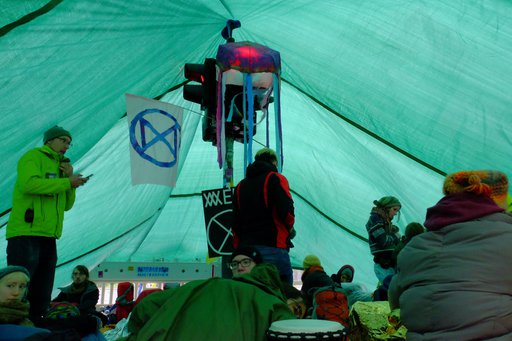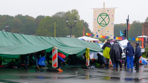 Die rosa Badewanne, an der sich mehrere Rebell:innen über Nacht festegekettet haben, wurde verschnitten. Die Strukturen wie das Zirkuszelt werden weiter abgebaut. Nun wird unsere "Bienenschwarm-Taktik" angewandt: Wir ziehen in kleinen Gruppen durch die Stadt und blockieren spontan weitere Orte. (bq)