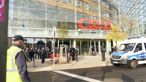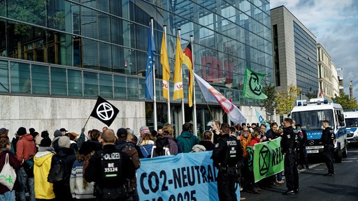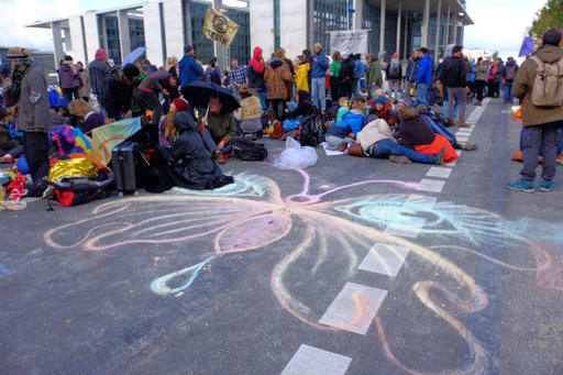 Am Konrad-Adenauer-Haus haben sich neun Aktivist:innen von Extinction Rebellion mit den Händen an den Zugängen festgeklebt. Die Polizei versucht das Gebiet abzuriegeln, aber außen hat sich eine schnell wachsende Spontanversammlung gebildet: Über 150 Rebell:innen haben sich zur Unterstützung vor Ort eingefunden.