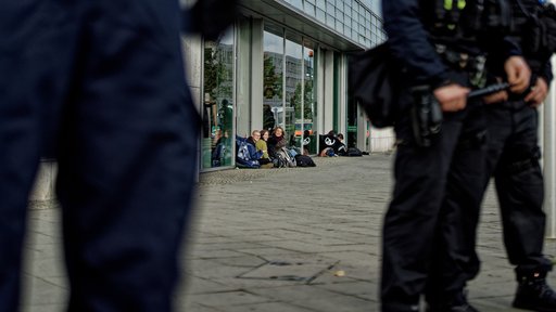 Ziemlich bald kommt das Sicherheitspersonal hinzu und fordert die Angeklebten auf, sich zu lösen - natürlich wird darauf nicht eingegangen und bald ist auch schon die Polizei vor Ort. Die Polistist:innen machen sich zunächst ein Bild der Lage, halten sich aber erst einmal professionell im Hintergrund. Denn zwischenzeitlich sind die Rebell:innen ins Gespräch mit dem Ministerium gekommen.