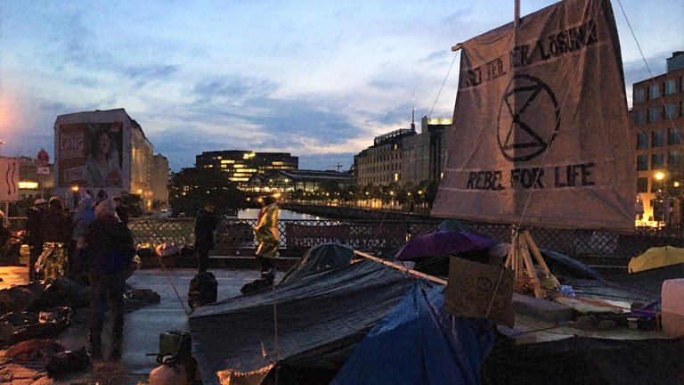 20-30 Rebell:innen hatten sich für die Nacht auf der Oberbaumbrücke eingerichtet, und trotz Regen lange ausgeharrt. Dann wurde eine Räumung vorbereitet. Die Rebell:innen vor Ort entschieden, das Angebot von der Polizei anzunehmen, stattdessen die Blockade an der Jannowitzbrücke zu verstärken und die Brücke zu räumen.