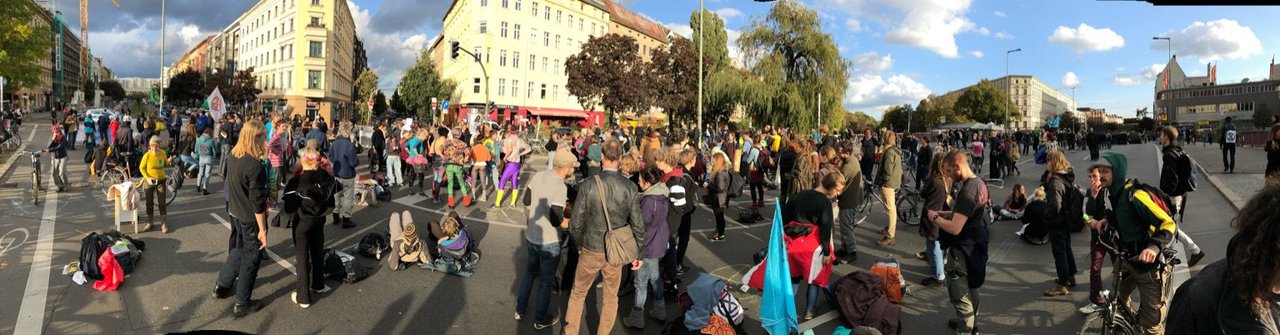 Heute Mittag halten wir, abgesehen von der Marshallbrücke, keine großen Veranstaltungsorte. Dafür schwärmen wir kleinen Gruppen in ganz Berlin aus, um Verkehrsknotenpunkte und Sehenswürdigkeiten mit kürzeren Blockaden zu stören und Aktionen zu bespielen: Das ist #PlanBee - das Bienennest-Vorgehen.