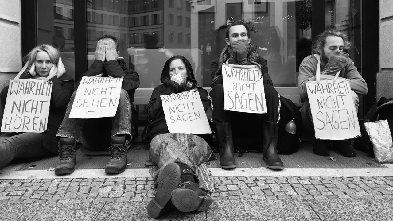 Um die Untätigkeit der Politik in der Klimapolitik zu unterstreichen, sitzen vor der Tür zahlreiche wetere Aktivist:innen mit Fahnen und Bannern und ahmen die drei Affen mit „Nichts sehen“, „Nichts hören“, und „Nichts sagen“ nach. Die drei Affen bedeuten im Ursprung, dass man über etwas Schlechtes weise hinwegsehen sollte. In der westlichen Welt hat sich die Bedeutung gewandelt, die Äffchen wollen „alles Schlechte nicht wahrhaben“.