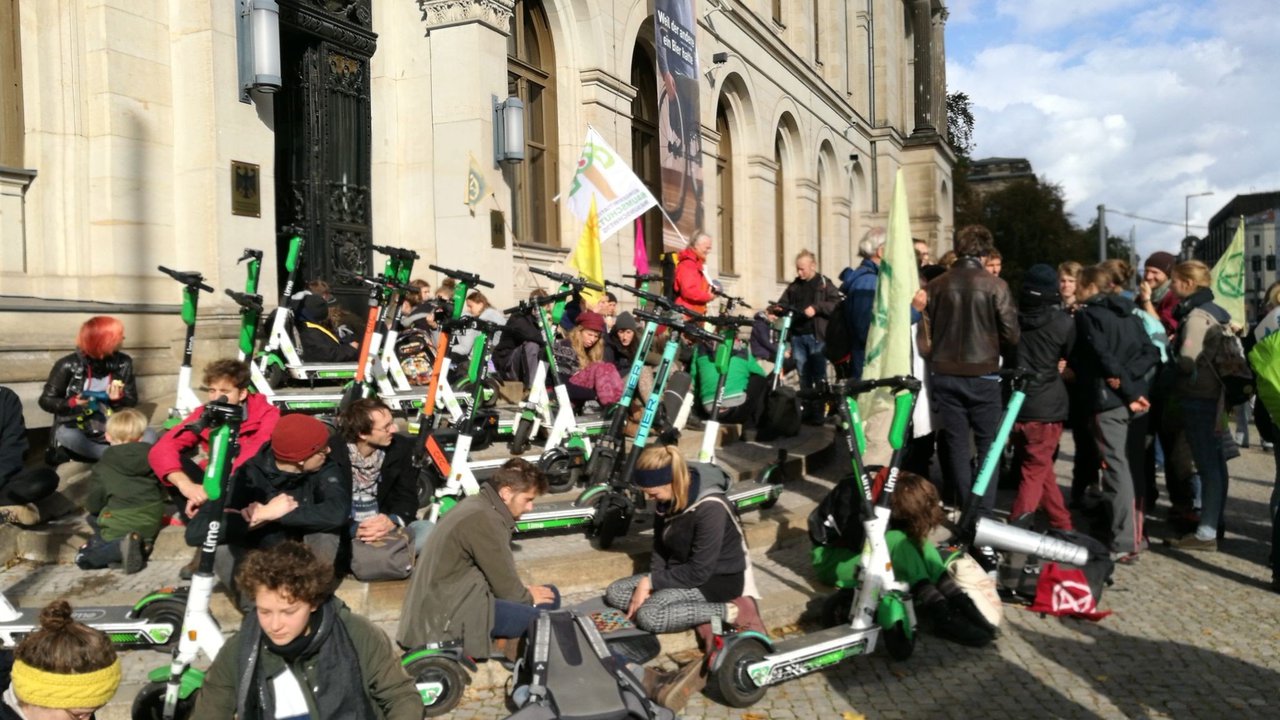 Nach einem Swarming schlossen sich hier etwa 200 Rebell:innen zusammen. Unter derm Motto "E-Roller sind #pillepalle, kostenlose Bahn für alle" fordern wir ein zukunftsfähiges, sozial gerechtes Mobilitätskonzept statt einem "weiter so" mit ein paar pseudo-grünen Komponenten. Das erst würde eine wirklich nachhaltige und sozial gerechtere Mobilität ermöglichen.