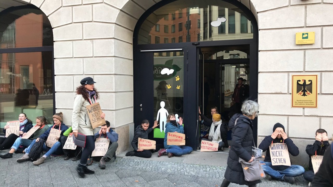 - 🔒 Glue-On am Umweltministerium in der Streesemannstraße mit 8 mit den Händen festgeklebten Menschen und etwa 40 Unterstützer:innen