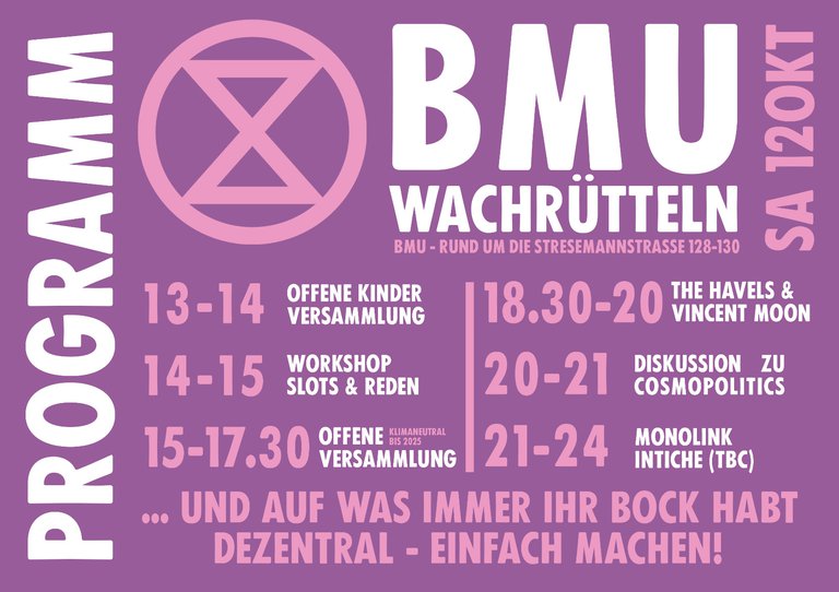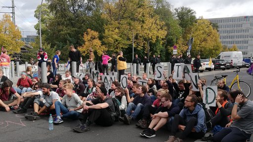 Unsere größte "Baustelle" ist heute weiterhin das Bundenministerium für Umwelt und Naturschutz (BMU). Mit dem Klimapaket freut sich das BMU über ein verbindliches Gesetz - wir sagen: Vielleicht ist das ein erster, winziger Schritt, aber es reicht beileibe nicht aus. Deswegen steht der heutige Tag in der Blockade der Stresemannstraaße ganz unter dem Motto BMU wachrütteln.