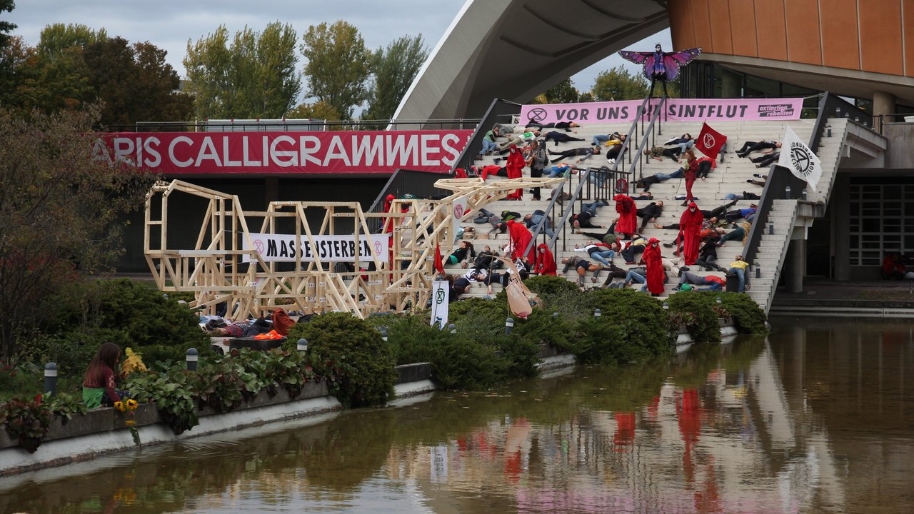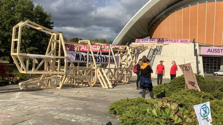 Die Ausstellung am Haus der Kulturen wird von uns mit Die-Ins und Performances der Red Rebels untermalt. Etwa 40 Rebell:innen "starben" dabei rund um Moby Dick - unser Wal konstruiert aus einem Holzgerüst. Währenddessen schritten die Red Rebels mit ihrer mystischen Ausstrahlung langsam um die Toten und den Wal herum. Nach gut 20 Minuten erwachten die Rebell:innen wieder und lauschten dem ruhig vorgetragenen "Statement of Intent": Wir sind hier, um dieser wunderbaren Erde zu helfen, um all den bedrohten Arten ein Weiterleben zu ermöglichen und um die Schönheit der Natur zu erhalten. Die ernste und friedvolle Zeremonie gab allen etwas Zeit, sich zu erden und sich mit der eigenen Motivation für die Rebellion zu verbinden.