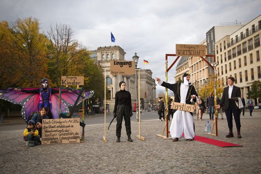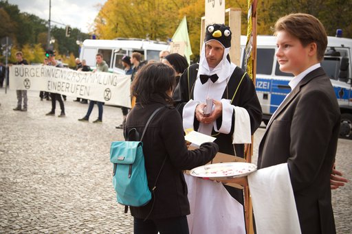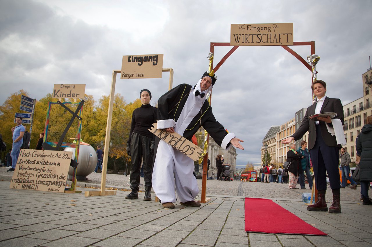 Am Brandenburger Tor wurden drei Türen mit Blick zum Reichstagsgebäude aufgebaut. Sie symbolisierten die Zugänge zur Regierung: der Eingang für die Wirtschaft war groß und komfortabel und mit rotem Teppich, Butler und "Häppchen" ausgestattet. Für Bürger:innen gab es einen Eingang mit Security Check und der Eingang für die Kinder war verbarrikadiert. Die Installation bezog sich auf die Frage: für wen wird Politik gemacht?