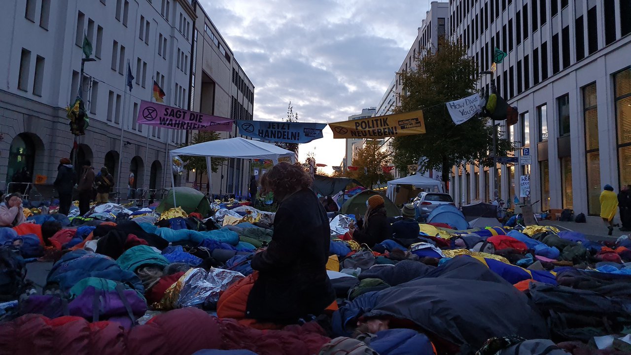 Während die Politik ihren Job nicht macht, gehen wir in die Überstunden. Das große Lager vorm Bundesumweltministerium (BMU) summt vor lauter Energie. Übernachtet haben hier gut 500 Rebell:innen nach einem langen und atmosphärischen Freitagabend.
