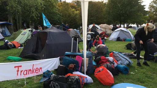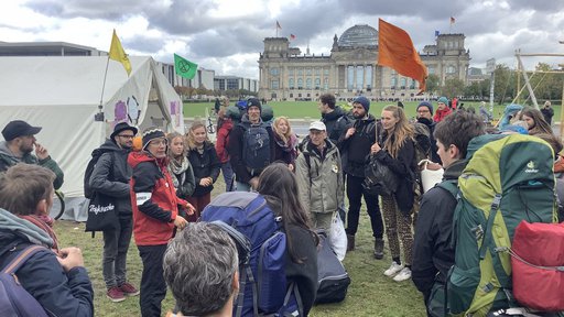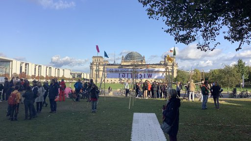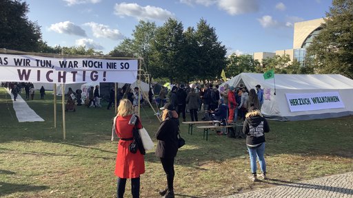 Direkt neben dem Kanzlerinnenamt und in guter Sicht zum Reichstagsgebäude wird das Klimacamp aufgebaut. Es gibt große Zelt für Info, Regeneration, Kunst und Workshops, einen großen Küchenbereich und eine eigene Bühne - auch für Toiletten ist natürlich gesorgt. Dazu kommt im Laufe des Tages eine Zeltstadt der Rebell:innen aus allen Teilen Deutschlands und Skandinaviens. Willkommen im Camp!
