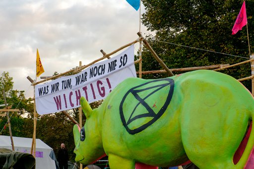 Musikalische Einstimmung auf die folgende Woche des Klimacamps. Der XR-Chor ist dabei als Klimastreifen kostumiert, die die sich erwärmende Welt visualisieren. Nachdem sie sich formiert und eingesungen haben, stimmen nach und nach mehr Rebell:innen ein und lernen das neue Repertoire an Liedern kennen, die extra für die Rebellion umgedichtet wurden. Auch die Begleitung mit Gitarre, Trommel und Querflöte findet sich spontan ein. bq