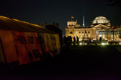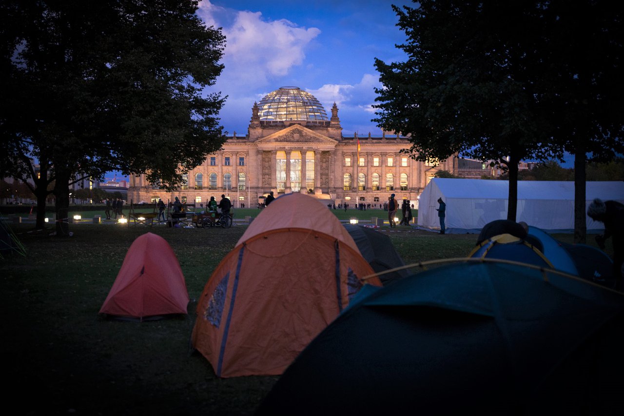 Im Licht des Reichtags und des Kanzler:innenamts geht der erste Tag im Camp zu Ende. bq