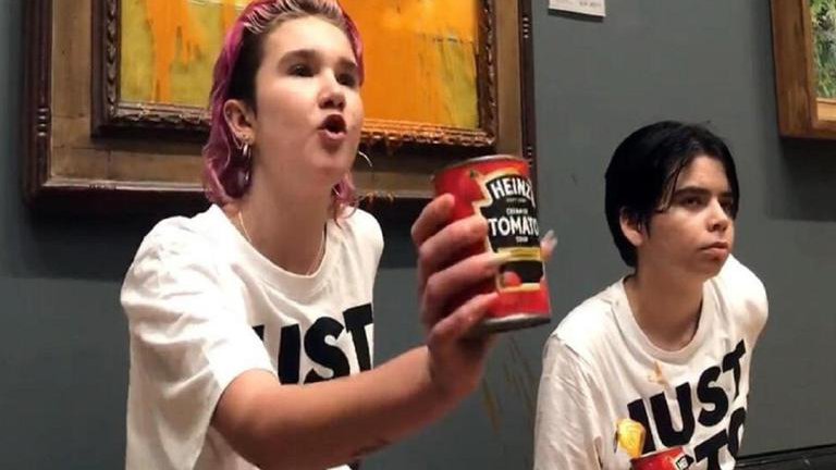 Aktivist:innen von „Just Stop Oil“ hatten in der National Gallery in London Tomatensuppe über das Gemälde „Sonnenblumen“ von Vincent Van Gogh geschüttet. Anschließend entledigten sie sich ihrer Jacken, um den Blick auf ihre „Just Stop Oil“-T-Shirts freizugeben und klebten sich an die Wand der Galerie.