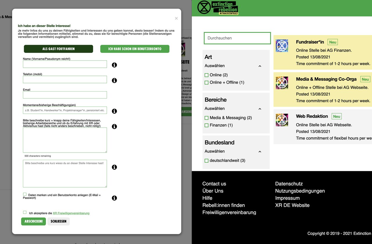 Unter mitmachen.extinctionrebellion.de könnt ihr als Orts-/Projekt-/Arbeitsgruppe offene Stellen ausschreiben und Interessierte können sich einfach per Kontaktformular eintragen und ihr bekommt dann eine E-Mail mit den eingetragenen Daten & Kontakt, um direkt in den Austausch zu gehen.