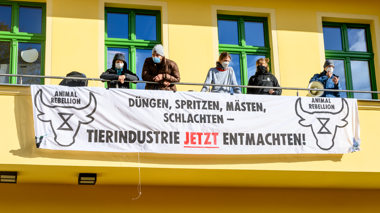 Vor der Parteizentrale und auf deren Balkon haben Aktivist:innen von Animal Rebellion mit einer Besetzung ihren Ungehorsam ausgedrückt und gefordert: Die Grünen sollen sich ihrer Verantwortung als Umweltpartei stellen und handeln – um das 1,5 Grad Ziel einzuhalten, ist eine Agrarwende und der Ausstieg aus der industriellen Tierhaltung unbedingt notwendig.