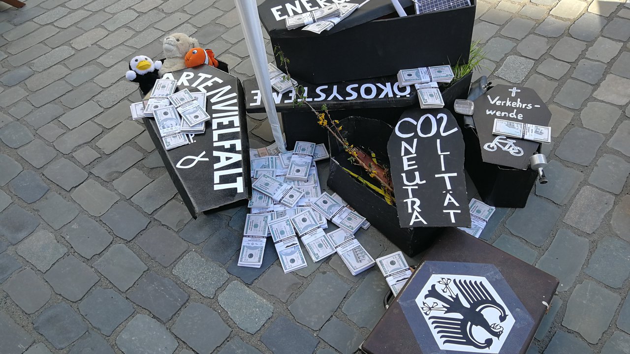 "Unsere Regierung investiert weiterhin Milliardenbeträge in Industrien von vorgestern. Wir brauchen zügig eine Wende in allen Wirtschaftsbereichen, wenn wir noch eine Chance haben wollen, die Erderwärmung auf deutlich unter 2 °C zu begrenzen und das massenhafte Artensterben zu beenden.", so Umweltaktivist Tim I. Er informiert für Extinction Rebellion über diese schädliche Wirtschaftspolitik. Die lokale Gruppe der Bewegung beerdigt mit ihrer Aktion u.a. die Verkehrswende und die Ökosysteme symbolisch unter den Milliarden-Subventionen.