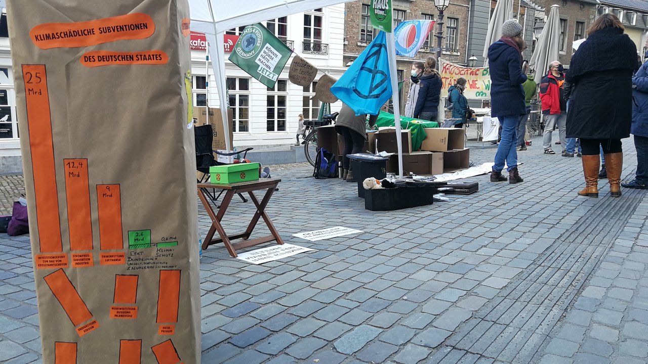 In der Nähe des Aachener Doms machen Gruppen wie Extinction Rebellion, Parents for Future und Scientists for Future auf die anhaltenden klima- und umweltschädlichen Subventionen durch die Bundesregierung aufmerksam und fordern zum sofortigen Handeln auf.