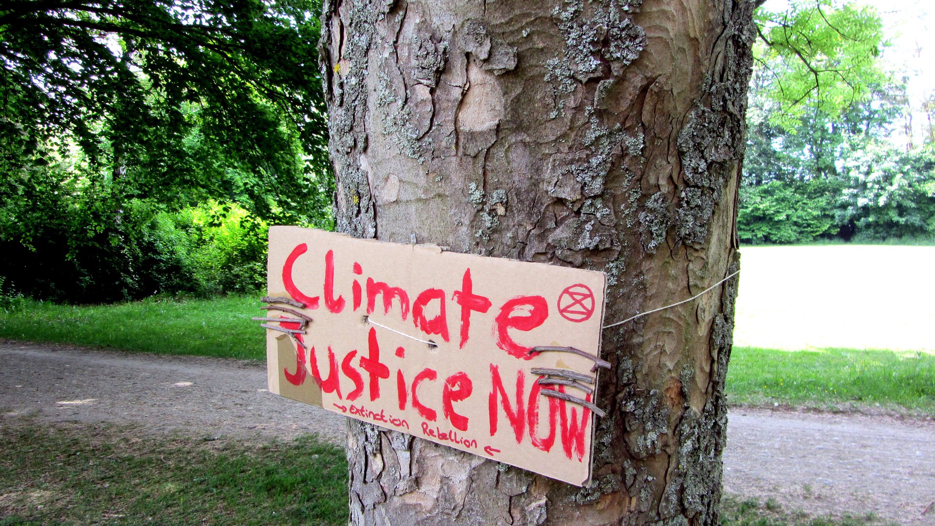 Baumdemo: "Climate Justice Now" als Demo-Schild eines Baumes