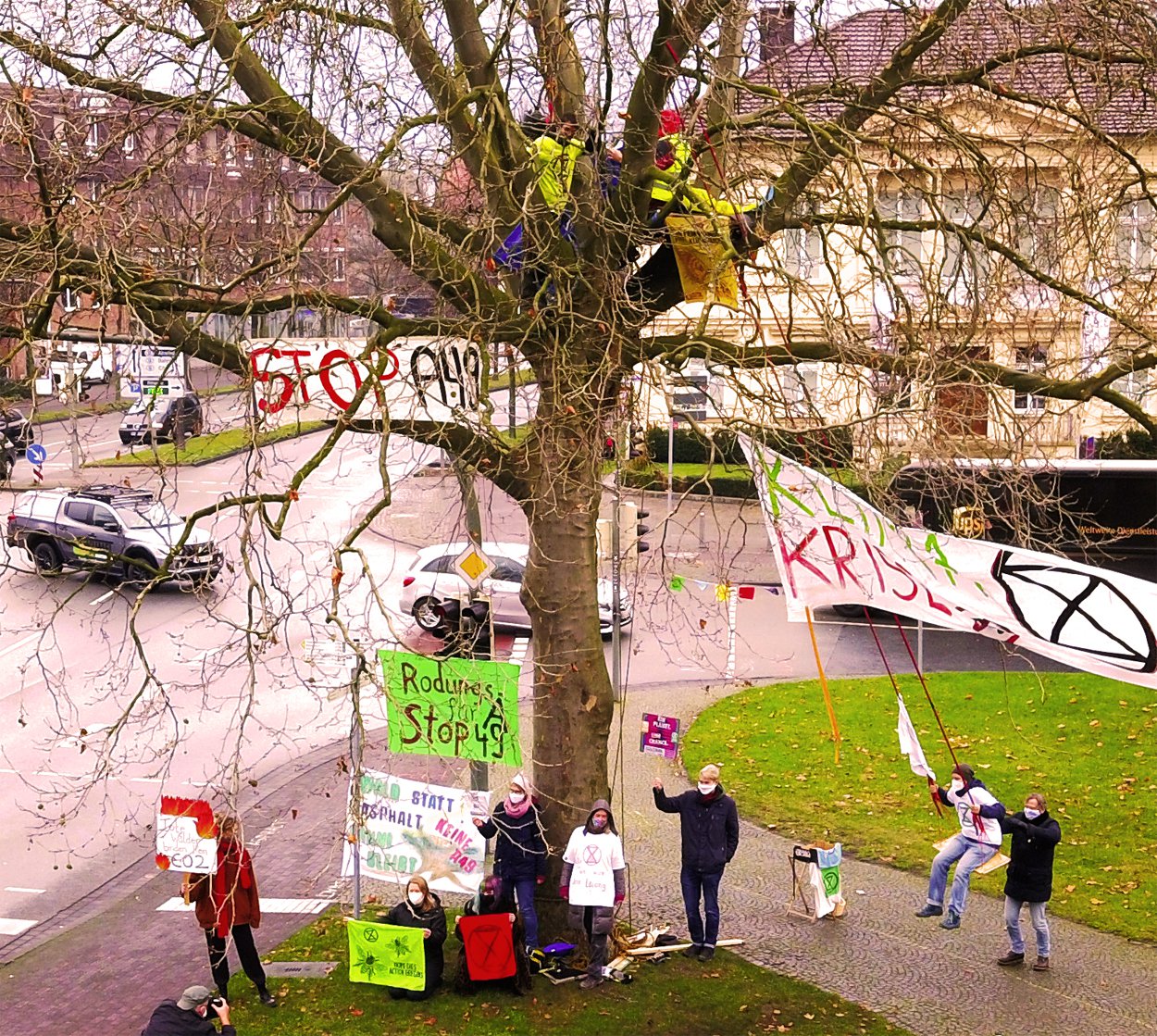 Am Donnerstag, den 26.11. veranstaltete XR Bielefeld eine spektakuläre Aktion auf einem hohen Baum neben der Kunsthalle. In den frühen Morgenstunden richteten sich die Klimaaktivisten hoch oben in der Baumkrone ein. Zahlreiche Banner mit Aufschriften wie " Stop A49 " , Wald statt Asphalt", "Verkehrswende jetzt" wurden im Baum und neben der Straße angebracht. Im Parkbereich wurden Schaukeln aufgehängt, musiziert und eine Choreografie von "staying alive" getanzt. Im Laufe des Tages beteiligten sich SchülerInnen vom Ratsgymnasium und viele andere Leute an der Aktion. Durch die Baumbesetzung erreichte XR Bielefeld erstmalig eine Berichterstattung in den lokalen Medien. Der großen Kampf der Umweltaktivisten für den Erhalt des Dannenroder Waldes und gegen die A 49 war nun im TV,im Radio und in Presse Thema und wurde in hunderten von Kommentaren in den sozialen Medien diskutiert