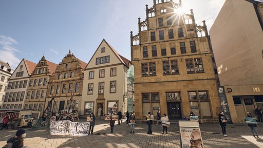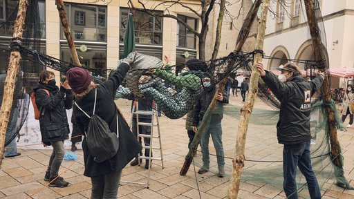 Am 27.3.21 veranstaltete XR Bielefeld zusammen mit ARIWA, ANIMAL SAVE und FAIRLEBEN eine spektakuläre Live - Perfomance, die das Ausmaß der Zerstörung der Meere und die Vernichtung ihrer Bewohner vor Augen führte: An einer großen, hölzernen Konstruktion wurde in drei Metern Höhe ein Fischernetz gespannt, in dem ein als Fisch verkleideter Mensch für die Dauer von drei Stunden gefangen war und so das Interesse zahlreicher Passant*innen auf sich zog.