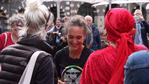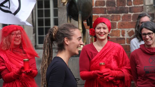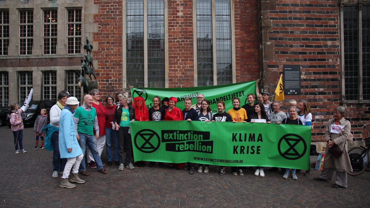 Draußen vor dem Rathaus bei den Bremer Stadtmusikanten standen wir von Extinction Rebellion um auf die globale Klimakatastrophe hinzuweisen. Wir hatten Carola schon im Voraus darüber informiert und sie war gerne bereit sich mit uns für einen Pressefoto ablichten zu lassen. Als kleines Präsent hatten wir zwei T-Shirts mit dem Bremen XR-Loge überreicht. Über dieses Geschenk hat sie sich sehr gefreut und hat gleich eines davon für die Fotos übergezogen.