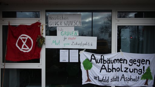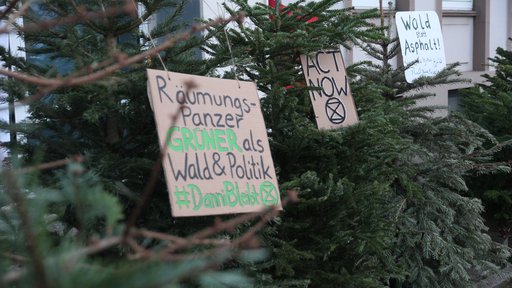 Die Rodung im Dannenröder Forst unter einem grünen Verkehrs- und einer