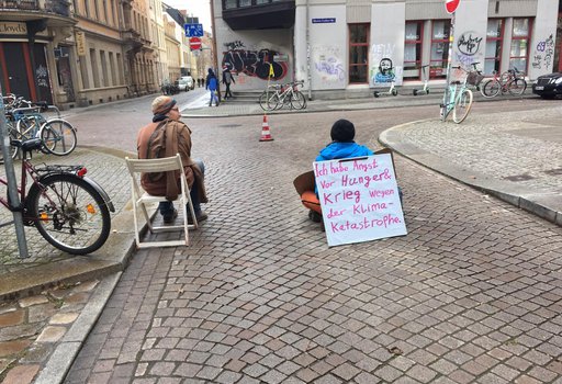 Als Ort war gewählt wo keine Autofahrer:innen "gefangen" werden können sowie wo Verkehrssicherheit möglichst gewährleistet bleibt. Somit hat die Person eine Einfahrt einer schmalen Einbahnstraße blockiert. Es wurde sich weniger ein konfrontatives, mehr ein demonstratives und zum Hemmschwelle gegenüber zivilem Ungehorsam senkendes Setting ausgesucht, womit die Wahl auf die äußere Neustadt fiel. Der Aktionsort war dann die Einfahrt in die südöstliche Martin-Luther-Straße am Martin-Luther-Platz.