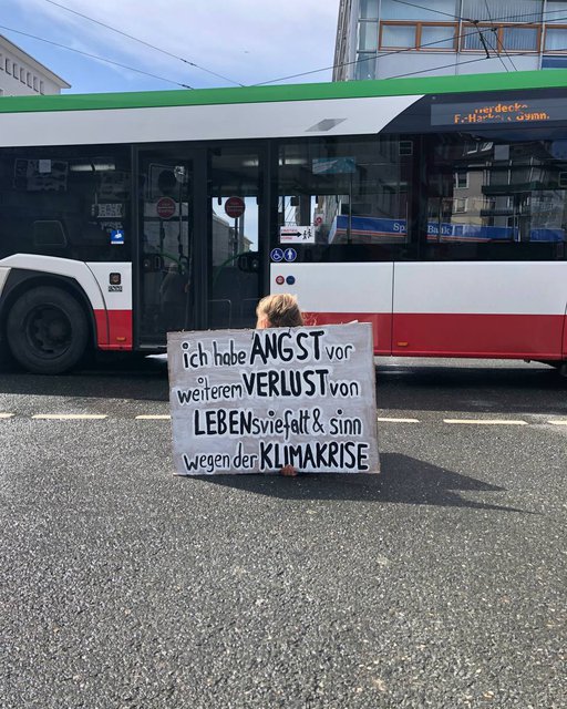 Unsere Verzweiflung wächst – und so auch die Zahl der teilnehmenden Rebell:innen an der Rebellion of One. Am 15. Mai haben sich fünf Aktivist:innen an der Mallinckrodtstraße in der Nordstadt, in der Kaiserstraße im Kaiserviertel, in der Saarlandstraße im Saarlandviertel, im Neuen Graben und an der Möllerbrücke im Kreuzviertel auf die Straße gesetzt. Sie trugen Schilder, auf denen sie sich zu ihren Ängsten bekannten. Dort stand z.B. „Ich habe Angst, dass unsere Ökosysteme kollabieren wegen der Klimakrise“ oder „Ich habe Angst, dass viele Menschen leiden müssen wegen der Klimakrise“.