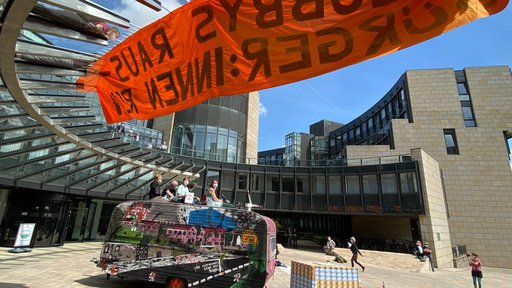 „Lobbys raus, Bürger*innen rein!“: Mit rund 30 Rebell:innen haben wir den NRW-Landtag besetzt und das Vordach des Gebäudes erklommen. Einige Aktivist:innen ketteten sich an einen Wohnwagen und an ein selbstgebautes Windrad. Wir fordern von der Landesregierung, dass sie sofort umfassend auf die Klimakrise reagiert. Um dafür die richtigen Entscheidungen zu treffen, soll die Landesregierung eine Bürger:innenversammlung einberufen.