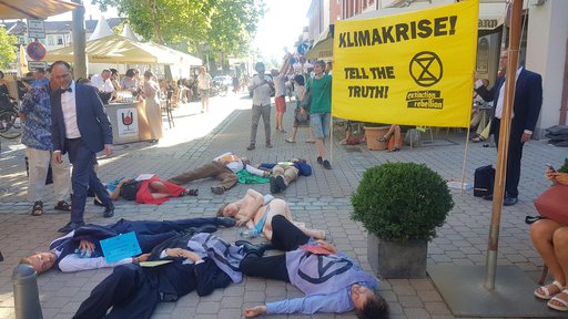Jedes Jahr im Sommer veranstaltet die Friedrich-Alexander Universität Erlangen-Nürnberg das Schlossgartenfest, an dem sich Reich und Schön die Hand gibt. Das perfekte Ereignis, um die Aufmerksamkeit der anwesenden Politiker*innen, Firmenchefs und Studierenden auf die aktuelle Problematik der drohenden Klimakatastrophe hinzuweisen. In Ballkleidern schmuggelten sich 20 Rebell*innen in die Warteschlange und zogen mit einem Die-In auf dem roten Teppich am Eingang die volle Aufmerksamkeit der Besucher*innen und der Presse auf sich. 10 Minuten lang mussten Gäste über leblose Körper steigen — die Klimakrise nimmt ja schließlich auch keine Rücksicht auf schicke Festivitäten. Anschließend wurde folgender offener Brief an die Zuschauer*innen verteilt, in dem die FAU Erlangen-Nürnberg aufgefordert wird, ihre Verantwortung in Zeiten der Klimakrise ernst zu nehmen und konkrete Maßnahmen zu beschließen: