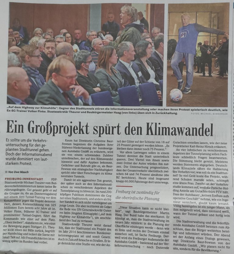 Am Donnerstagabend, 8.12.2022 hat eine bewegungsübergreifende Gruppe aus der Freiburger Klimagerechtigkeitsszene die Infoveranstaltung zum Stadttunnel im Konzerthaus gestört. Extinction Rebellion Freiburg hatte die Aktion geplant, der sich einige Aktivisti anderer Klimagerechtigkeitsgruppen angeschlossen haben.