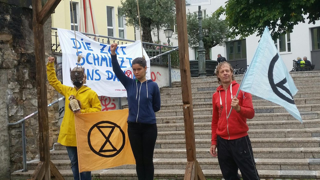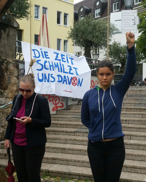 ... haben Aktivist:innen der Ortsgruppe Freiburg von Extinction Rebellion auf dem Augustinerplatz in einer drastischen Inszenierung auf die unzureichende Klimapolitik im Angesicht der drohenden Klimakatastrophe aufmerksam gemacht.