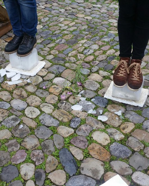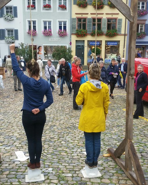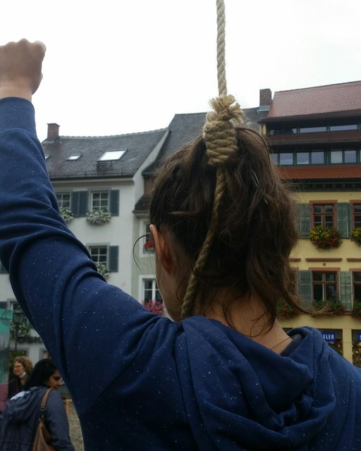 ... abgelenkt aufs Handy schauen und nebenbei die Wirtschaft den Eisblock beföhnt und befeuert. In der satirischen Aktion standen zwei Personem mit Strick um den Hals am Galgen auf einem schmelzenden Eisblock, umringt von Aktivist:innen mit Handy und Föhn, die untätig bleiben und nicht in das Drama eingreifen.