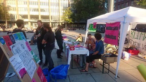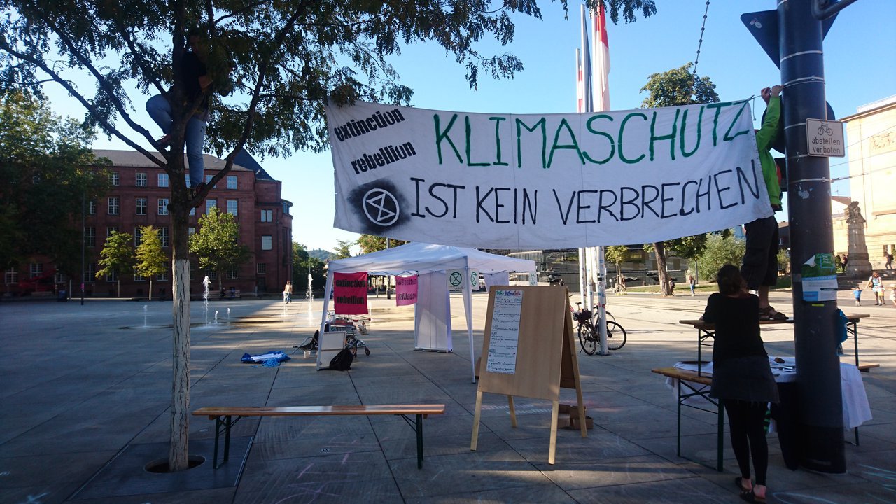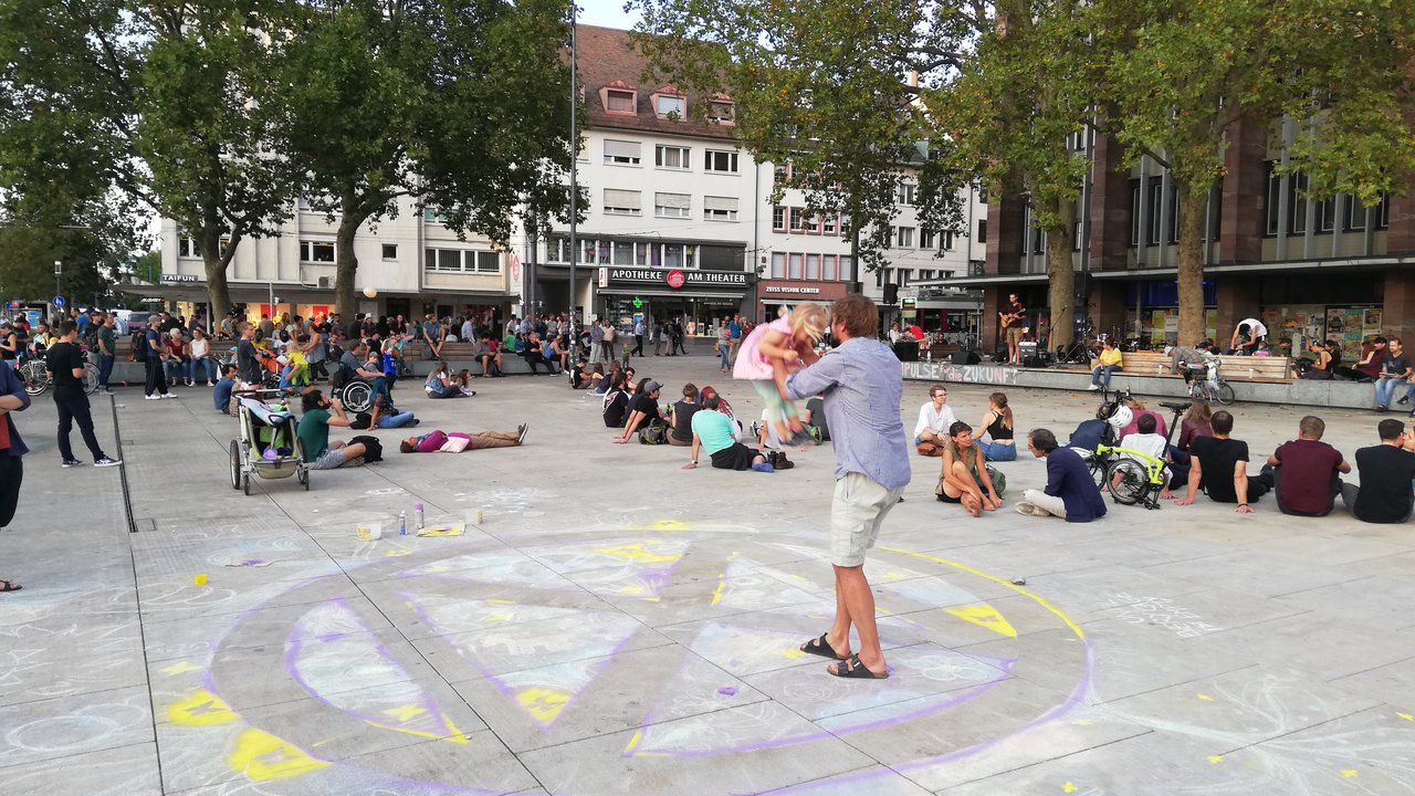 Im September 2019 standen wir jeden Tag mit einem Pavillon auf dem Platz der alten Synagoge, mitten im Zentrum Freiburgs. Hier kamen wir mit Bürger:innen ins Gespräch, verteilten Info-Material und machten viele bunte Veranstaltungen. Es gab Workshops, Gesprächskreise und Aktionen. Die XR Families-Gruppe und weitere Freiburger AGs trafen sich. Ein bunter, kreativer Raum zum Austausch zwischen XRler:innen untereinander entstand. Passant:innen nutzten dieses sehr niederschwellige Angebot, sich einfach über die KlimaKrise und unsere Bewegung zu informieren. Unser Pavillon wurde auch Kontaktpunkt für andere Umwelt-Bewegungen, an uns heranzutreten.