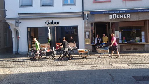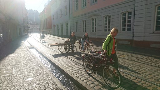 Den Pavillon, Bierbänke und weiteres Material durften wir auf 2 Fahrradanhängern bei der Studierendenvertretung lagern. Jeden Morgen zogen einige tapfere Helfer:innen los und bauten den Infostand auf.