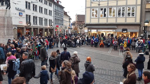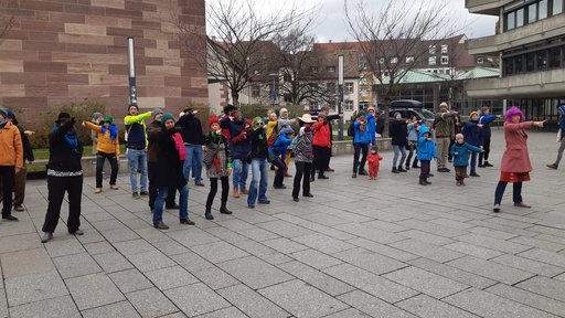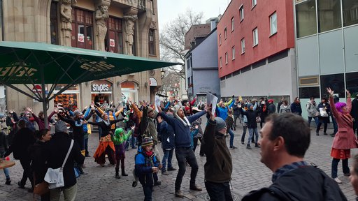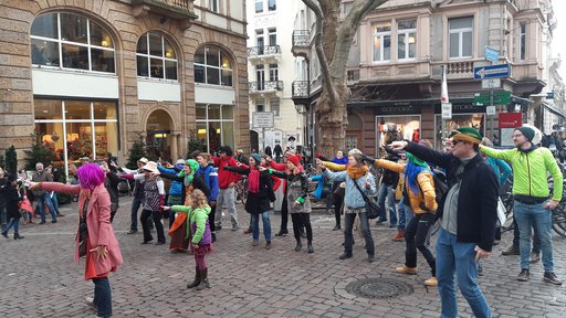 Am Samstag vor dem zweiten Advent tanzten wir den Freiburger:innen etwas vor. Zeitgleich mit Rebels in Madrid und vielen anderen Städten weltweit sangen und tanzten wir zu "Staying Alive"! An mehreren Stationen in der vorweihnachtlich vollgepackten Fußgängerzone bildeten wir einen bunten, gutgelaunten Straßenblock.