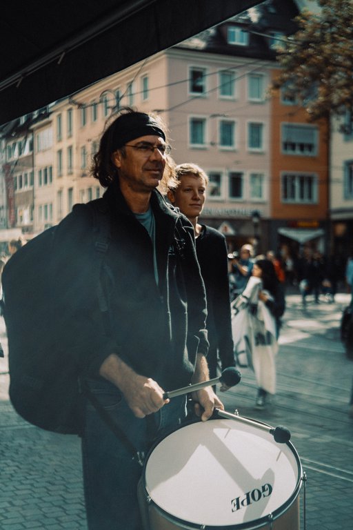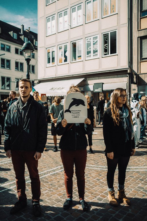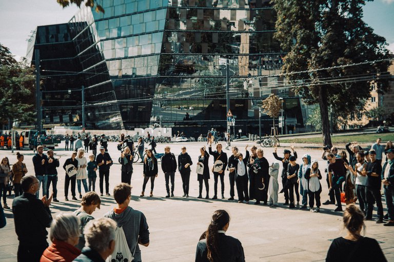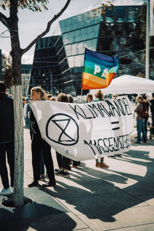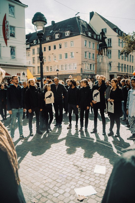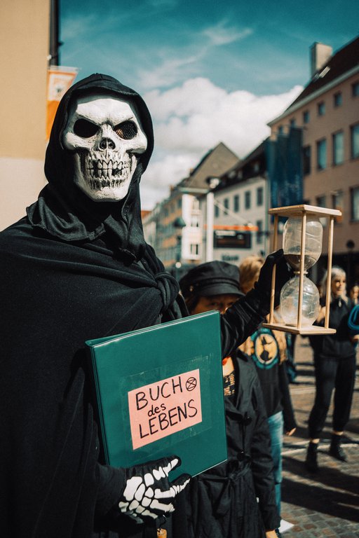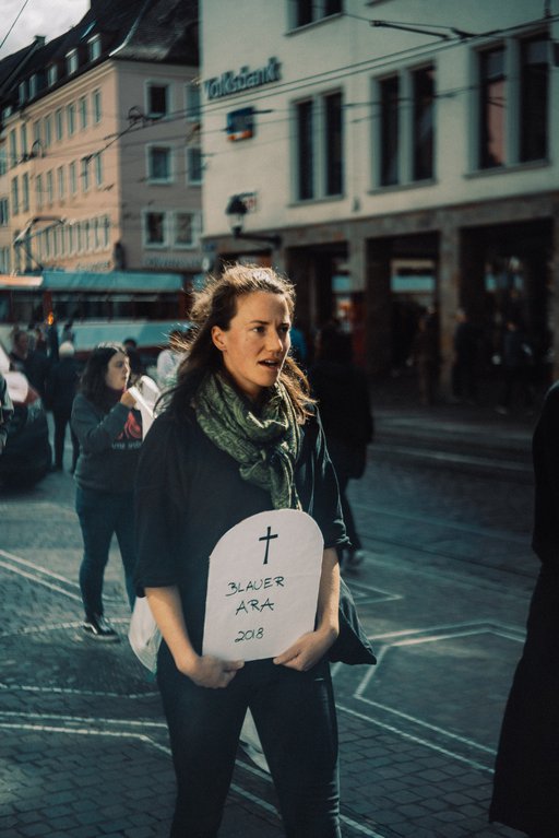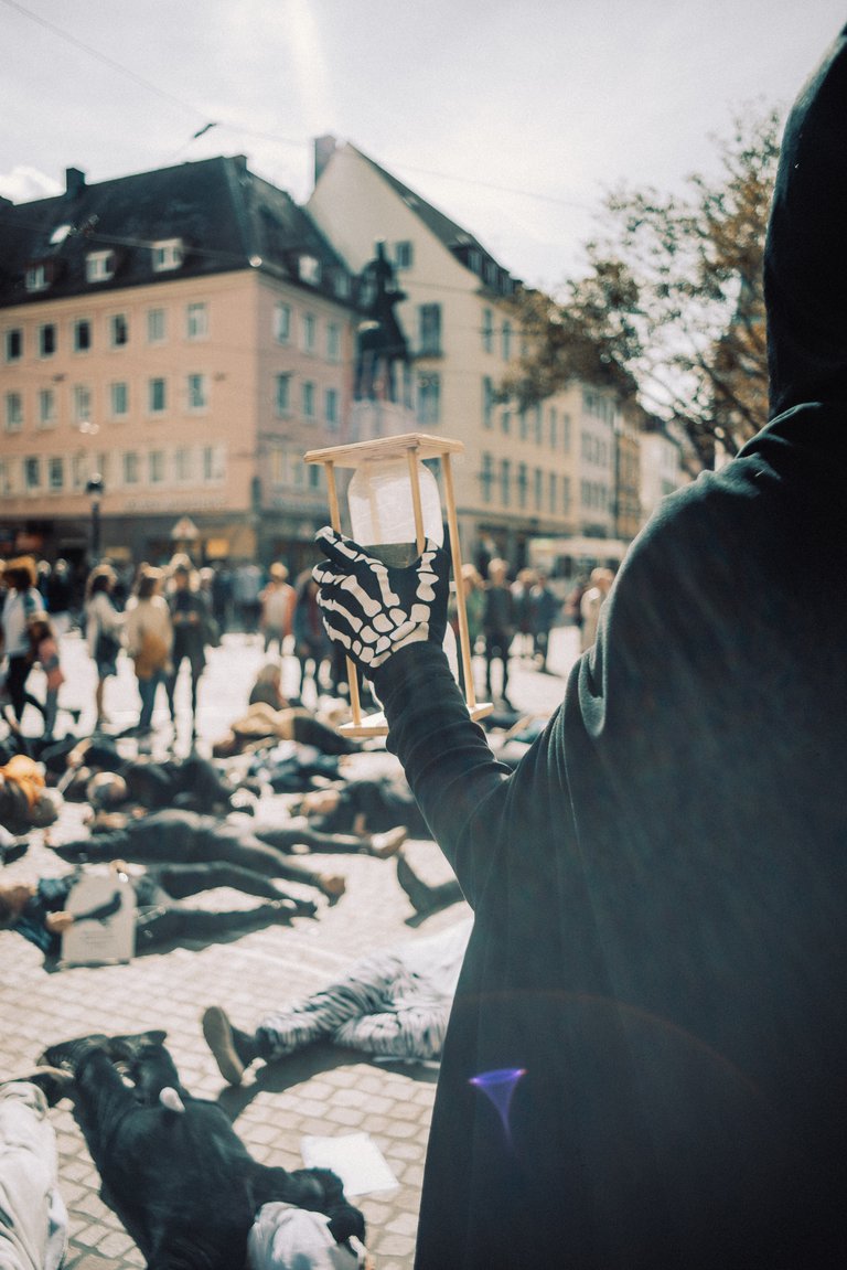 Wir trauern öffentlich. Unser Trauerzug geht vom Platz der alten Synagoge, an der gerade unsere KLIMAhnwache steht, zum Bertoldsbrunnen, einem der zentralsten Orte der Stadt. An unserer Seite schreitet der Tod.