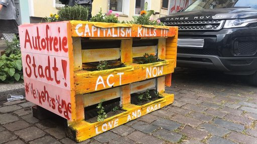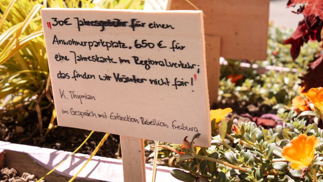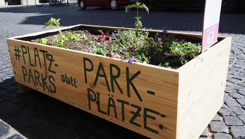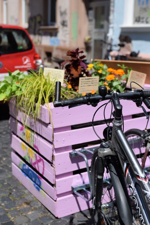 Plötzlich stehen im Freiburger Sedanviertel Holzkisten anstatt Blechkisten – und da kommen duftende Blumen anstatt stinkender Feinstaub raus – was hier brummt sind nur die Bienchen und nicht der Diesel!