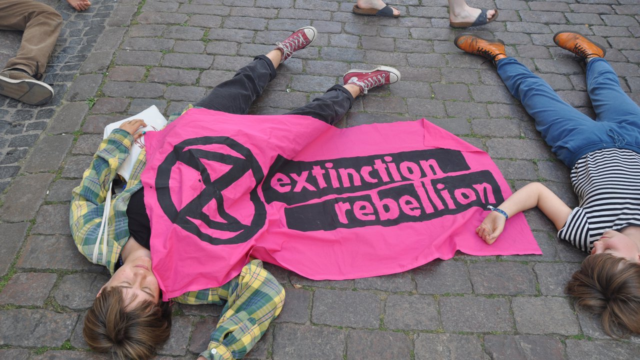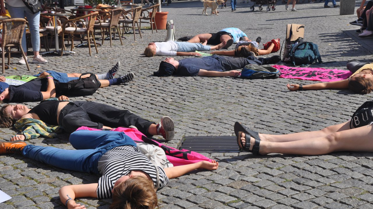 Auf dem Markt und in der Fussgägnerzone stellen wir uns symbolisch tot um auf die existenzielle Bedrohung für unsere Zukunft aufmerksam zu machen.