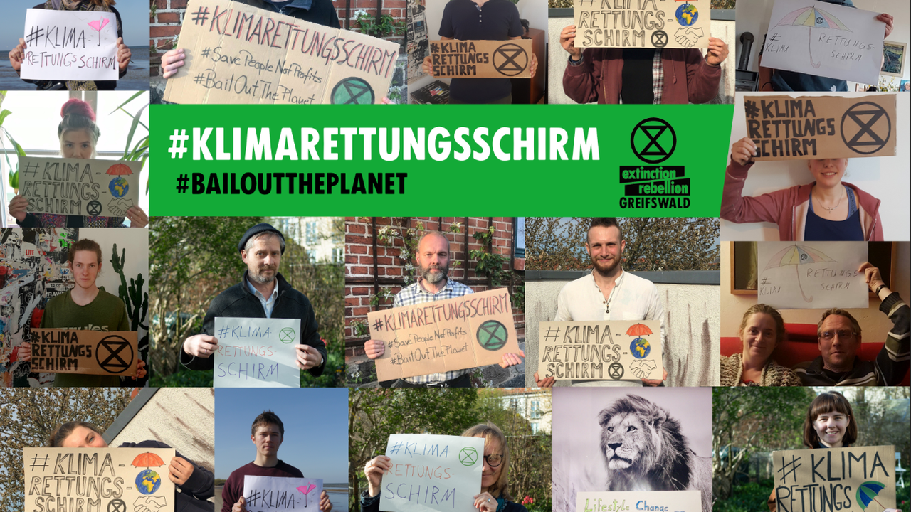 Als Teil einer bundesweiten Kampagne zur Nutzung von Geldern für eine lebenswerte Zukunft fordern wir seit April einen #Klimarettungsschirm. Schnell haben einige Rebell:innen für eine Fotocollage die Forderung auf Schildern sichtbar gemacht. Wir müssen jetzt handeln!