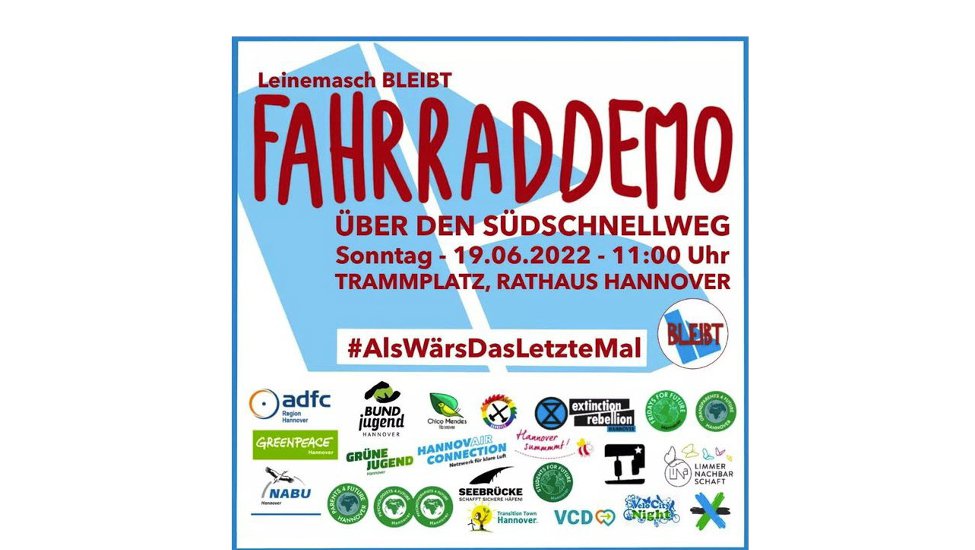 Große Fahrraddemo über den Südschnellweg. Gegen die Schnellwegerweiterung mitten durch die Leinemasch, die damit für zehn Jahre zur Großbaustelle würde. So. 19. Juni 22