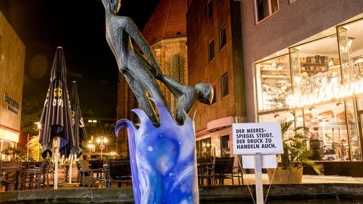 >>> Spielende Kinder in der Grupenstraße verwandeln sich in der Zukunftsperspektive in die Generation, die für unsere Versäumnisse zahlen wird und die Folgen der Klimakatastrophe ausbaden wird. Ihre Botschaft: »Der Meeresspiegel steigt. Der Druck, zu handeln, auch.«