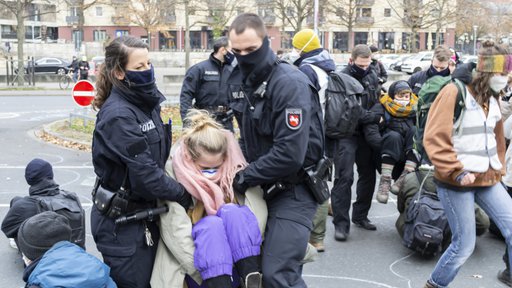 Hannover, 11. Dezember 2020. Seit 12.30 Uhr blockieren rund 80 Aktivist:innen von Extinction Rebellion (XR) und Ende Gelände (EG) aus Hannover, Lübeck, Lüneburg, Hamburg, Hildesheim, Braunschweig, Bremen und Göttingen das Leibniz Ufer vor dem niedersächsischen Ministerium für Umwelt, Energie, Bauen und Klimaschutz in Hannover. Acht von ihnen haben sich auf der Straße angekettet.
