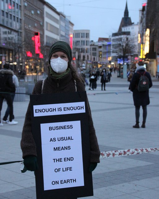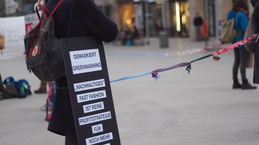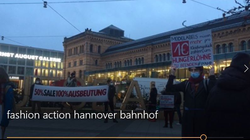 Am heutigen Freitag, den 12. März 2021, hat XR Fashion Action, eine Gruppe von Extinction Rebellion, in der Fußgängerzone mitten in Hannover diesen Produktionswahn der Modeindustrie angeprangert. Denn auch wenn die Läden coronabedingt geschlossen und die Innenstädte eher leer sind: die Kleiderberge sind da, die Zerstörung bleibt, die Ausbeutung auch. Mit Bannern, Plakaten und einem kurzen Vortrag haben die Aktivist*innen klar gemacht: