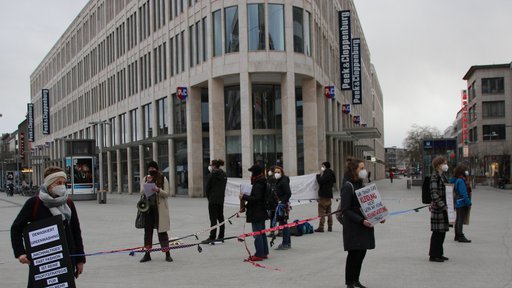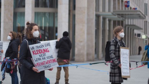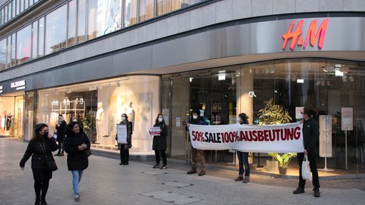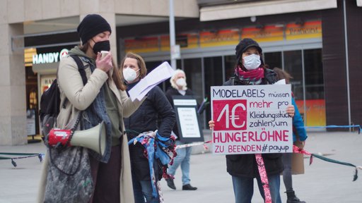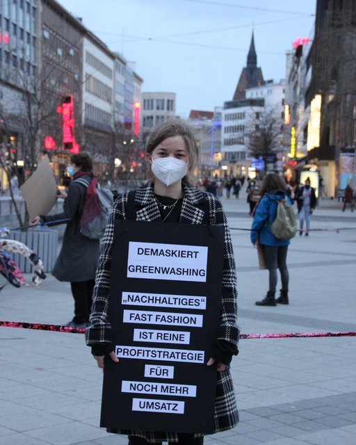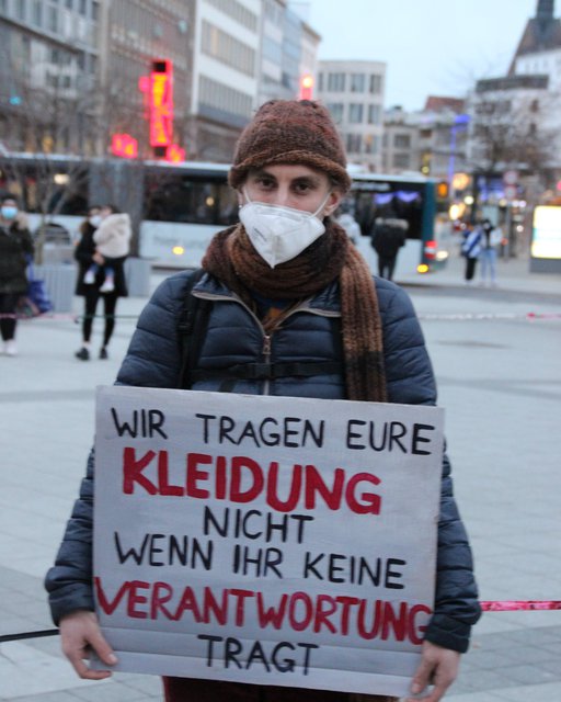 "Wie unverschämt ist es also", heißt es in der Rede, "dass diese Konzerne uns mit ihren Rabatten dazu bringen wollen, ihnen den Berg giftigen Kleidungsmüll abzukaufen, den Arbeiter*innen produziert haben, die sie jetzt verhungern lassen? Kleidungsmüll, der Böden, Wasser, Klima für alle Zeiten ruiniert?