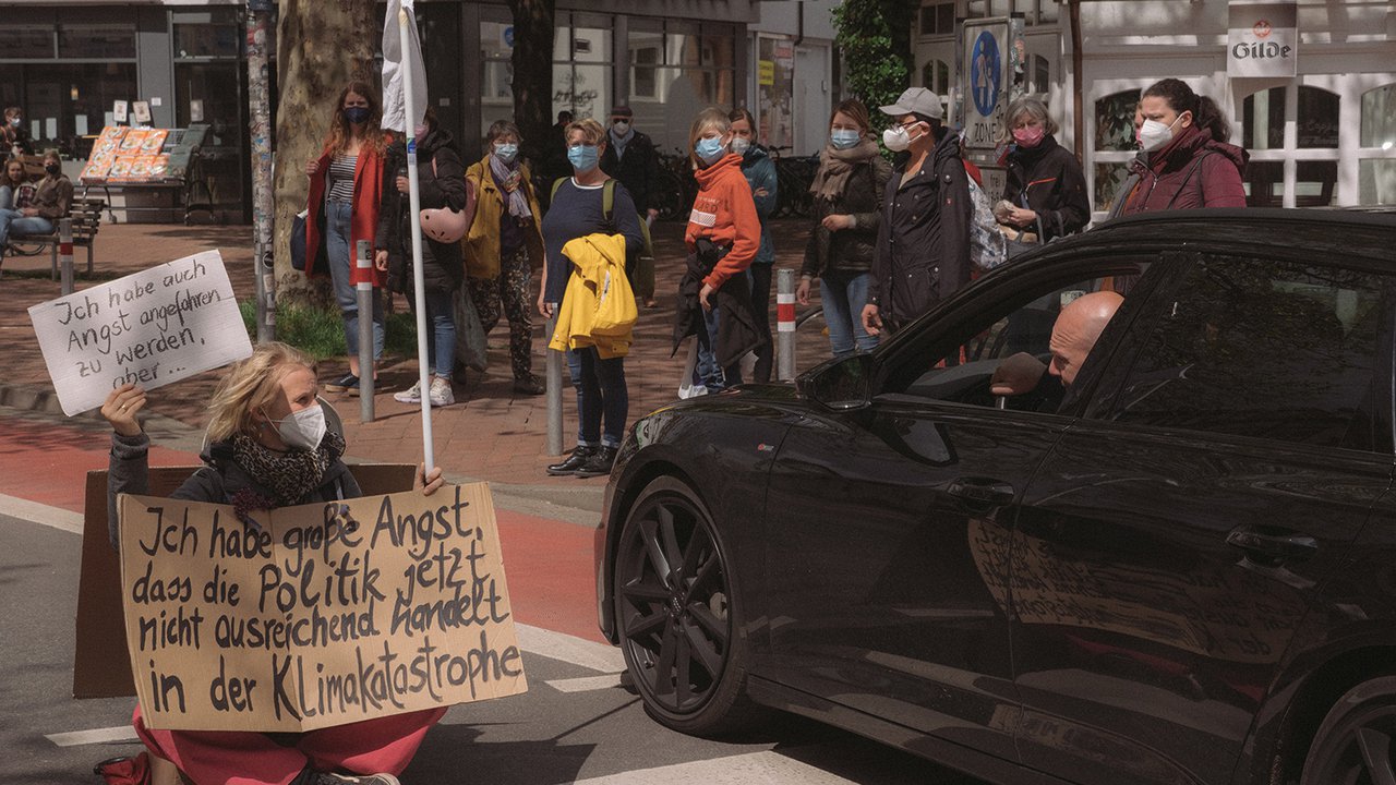 Hannover, 15. Mai 2021. Heute Mittag um 12 Uhr haben sich in Hannover zwei Frauen und ein Mann jeweils allein auf Straßen im Zentrum, in Linden und in der List gesetzt und diese damit blockiert. Auf umgehängten Pappschildern war zu lesen, was sie zu ihrem Schritt getrieben hat: Sie wollten ihrer Angst und Verzweiflung im Angesicht von Klima- und ökologischem Kollaps einen Ausdruck geben. Die Reaktion vieler Hannoveraner*innen ist bewegend.