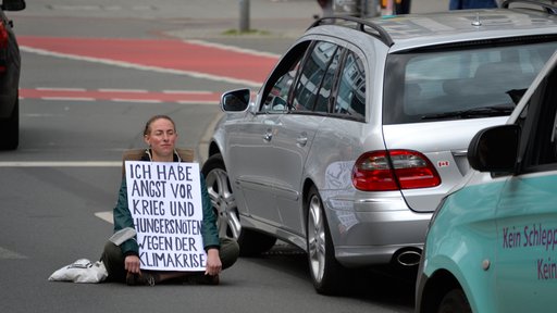 Auf der Gustav-Bratke-Allee am Schwarzen Bär in Linden sitzt Evelyn Gersemsky. "Ich habe mich heute auf die Straße gesetzt“, erklärt sie, „weil ich verzweifelt darüber bin, wie verschwindend wenig unternommen wird, um die Klimakatastrophe aufzuhalten. Durch ihre Untätigkeit setzt die Regierung schon heute im globalen Süden und in Zukunft auch hier unzählige Menschenleben aufs Spiel, und das kann und will ich nicht so hinnehmen." Auf ihrem Plakat steht: Ich habe Angst vor Krieg und Hungersnöten wegen der Klimakrise.