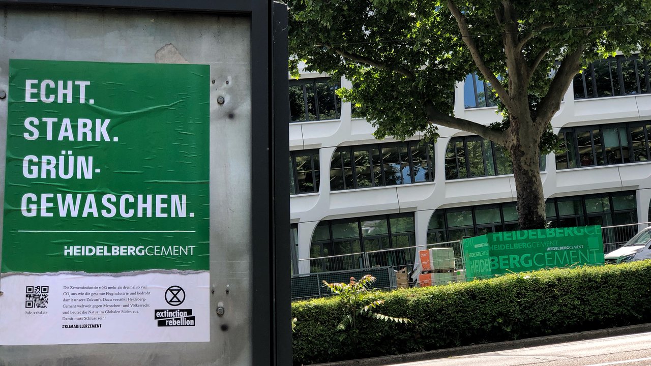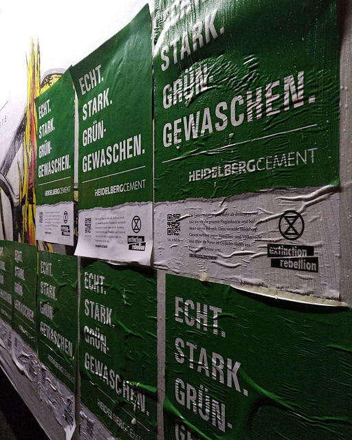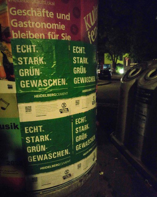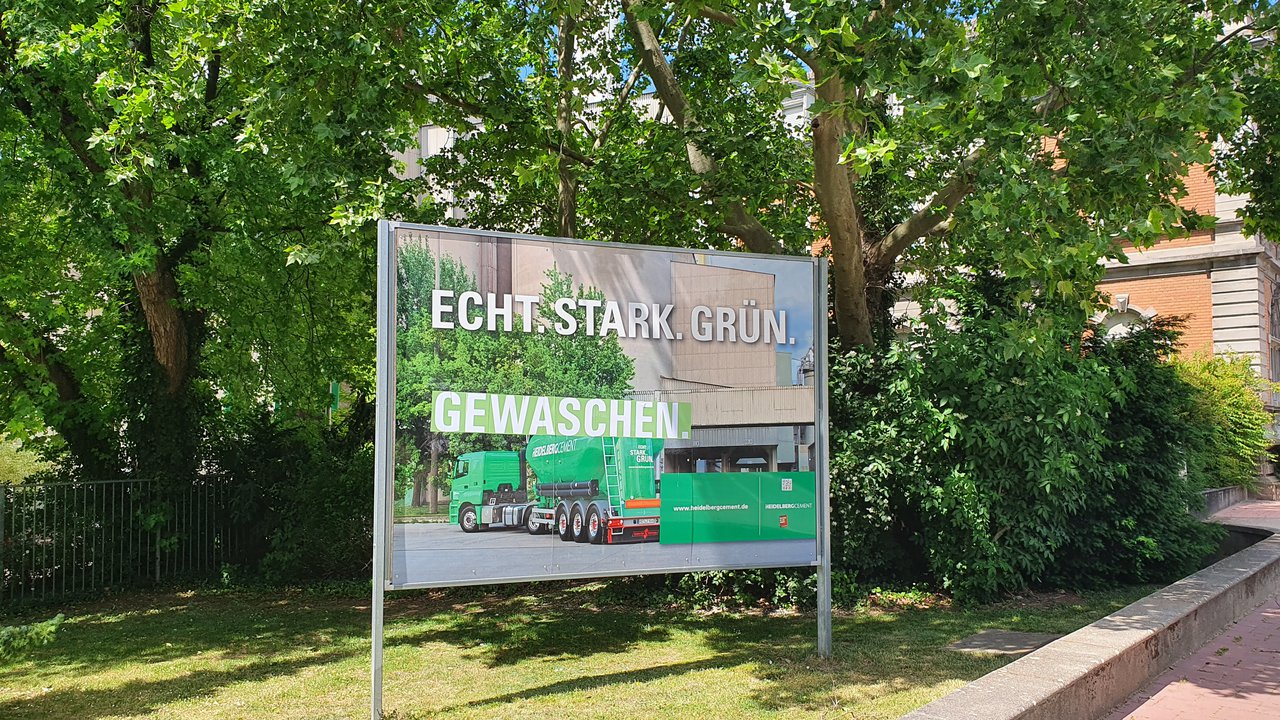 HeidelbergCement ist in Deutschland nach RWE der Konzern mit dem zweihöchsten CO₂-Ausstoß und hat es trotzdem bisher erfolgreich geschafft, sich zu greenwashen: Ihr Werbespruch lautet ironischerweise "Echt.Stark.Grün."...